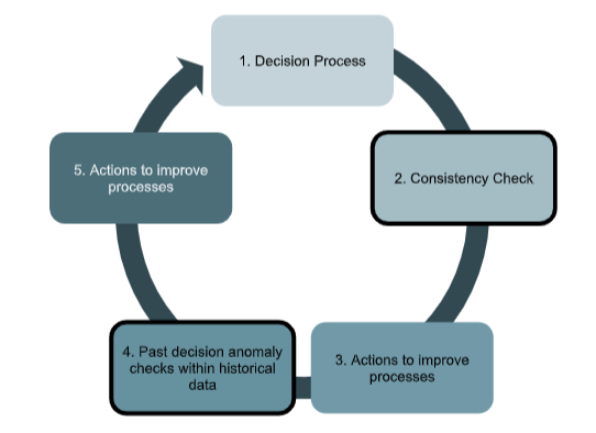 FairBorrow™.Ai enables a continuous improvement to the decision-making process by providing decision-makers, such as underwriters, the option to check their decisions for consistency. Such checks can be performed at single-decision levels, or in bulk, such as one week’s worth of loans. An underwriting team leader can, in some instances, also submit a group of loans on behalf of the members of the underwriting team. The consistency checks provide underwriters actionable intelligence on which areas to focus to reduce or eliminate decision consistency.